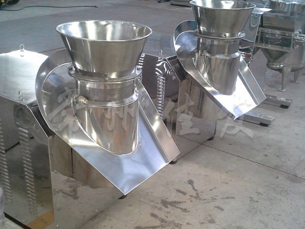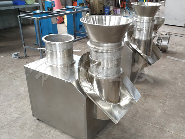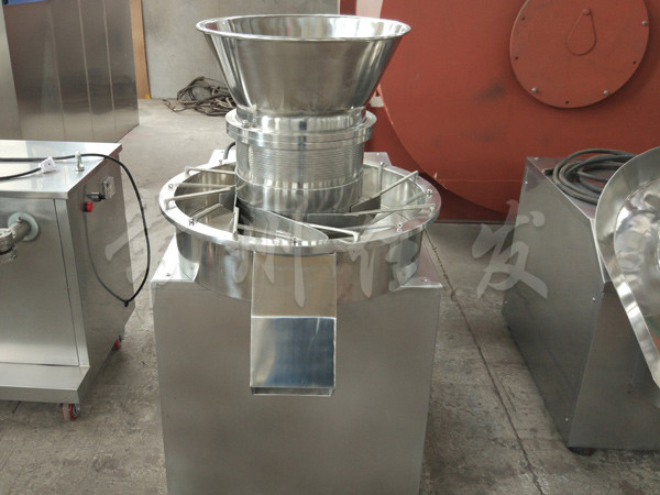 本機是通過一組旋轉(zhuǎn)碾刀,將前道工序制成的濕材注入環(huán)碾刀的不銹鋼篩筒篩孔中,從而制成圓柱狀的濕顆粒,供下道工序拋丸使用。本設(shè)備可通過更換不銹鋼篩筒來取得不同大小的顆粒。